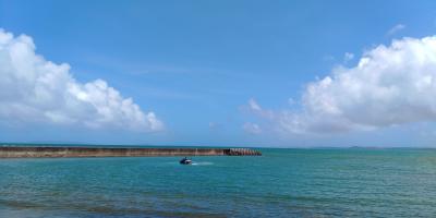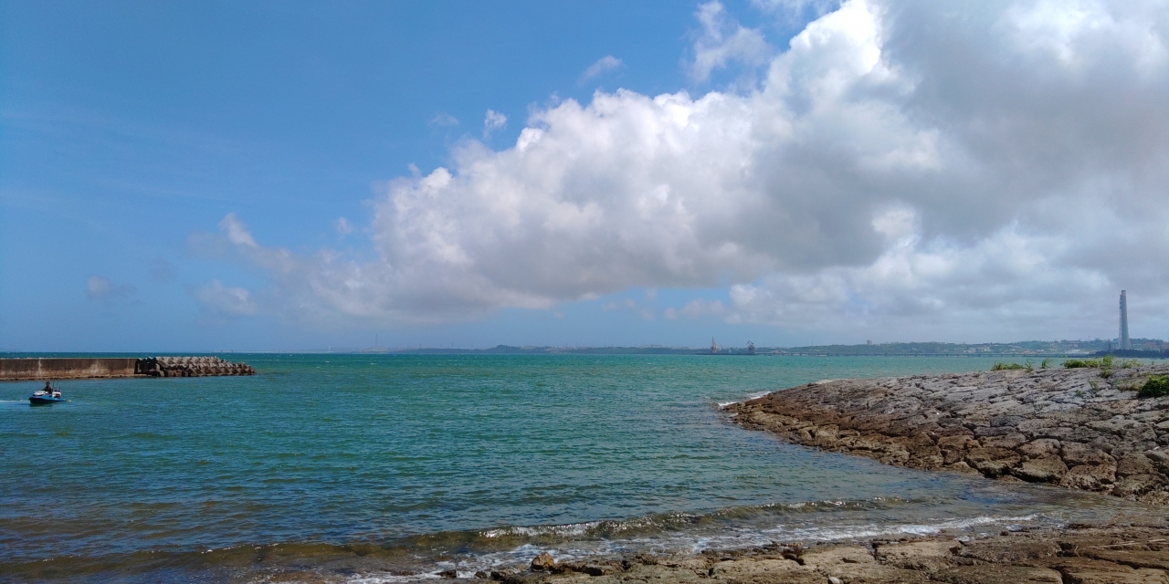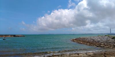 沖縄自動車道を石川インターチェンジで降り、国道329号を金武町方面へ北上すると、「屋嘉ビーチ」という案内が路上に出ているのでそこで右折すると"漁港のような場所"に出ます。漁港なのか否か私には分からないため、仮に"漁港"と呼びます。この"漁港"の隣が屋嘉ビーチです。車は"漁港"に駐車できます。