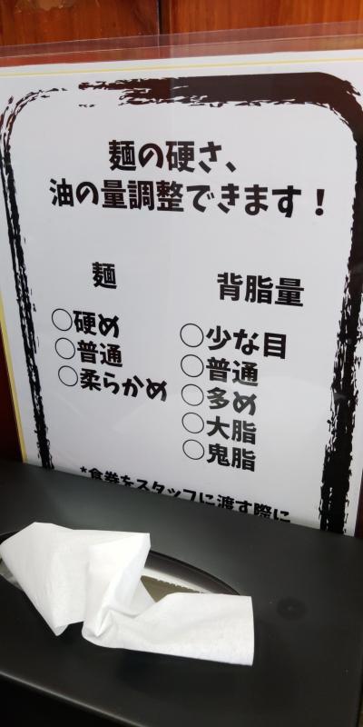 食券を店員さんに手渡す際に、麺の硬さと脂の量を訊かれます。