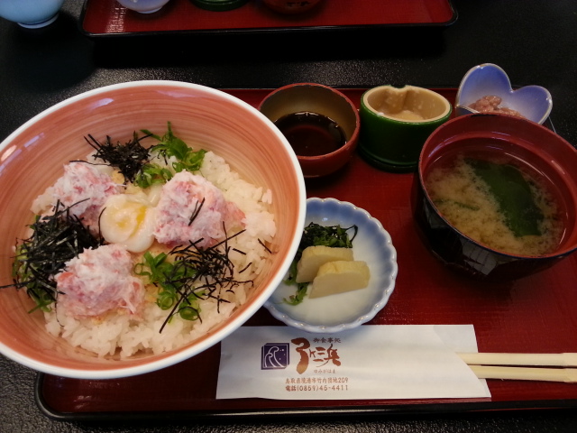 がいな鬼太郎の石の像がある大漁市場なかうらに隣接しているお食事処「弓ヶ浜」です。観光バスも停まっていてるので団体の観光客向けっぽいです。土曜日だったので家族連れの観光客が多いように感じました。お座敷もあるので小さなお子様連れには良さそうです。人気ナンバー1のメニュー「かにトロ丼」をいただきました。ど~ンとかにのイメージでしたが上品な盛り付けで見た目は普通でした。味の方はかにの甘みととろろの組合せがぴったりで美味しくいただきました。