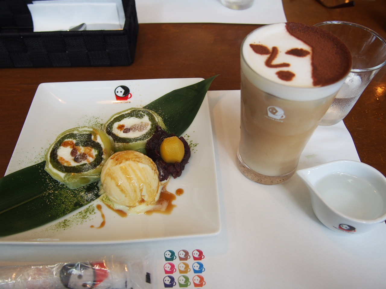 写真撮りたくて私は迷わずよーじやの顔のアイスラテとよーじや和風ロールケーキ注文しました。お皿やおしぼりやシートもイラスト入りでほっこりとし可愛らしいです♪