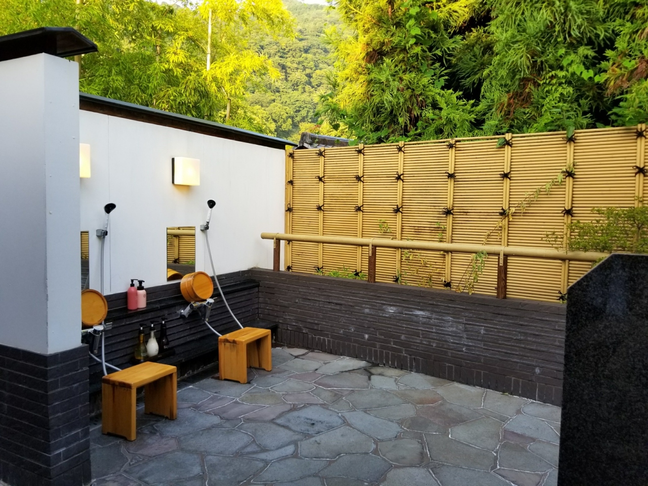 黒川温泉露店めぐり入湯手形での利用でした。24か所中3か所に入浴できます。湯めぐり絵地図の中で一番気になったのがこちらいこい旅館の竹につかまり湯につかる立湯でした。受付もスムーズでした。お風呂は思ってた以上に深く立ったままお湯に入ります。わたし身長162cmくらいですが足をつけて立つとちょうどいい高さでした。背の低い方でも中央につかまれる竹があるのでそれにつかまっていれば大丈夫です!