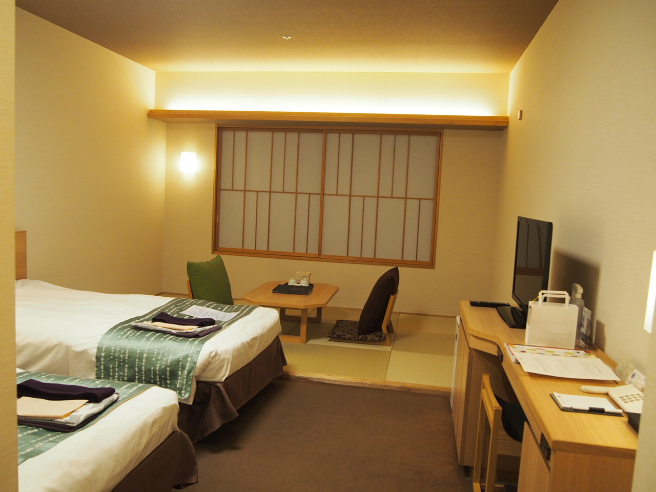 2014年にグランドオープンとのことで綺麗なホテルです。京都駅から近いので立地がとっても良く、しかもホテル最上階には天然温泉があります!宿泊したお部屋はツインベットと畳コーナーがあるのでゆっくりとくつろぐことが出来ました。食事も夕食は一階のレストランにて上品な夕食をそして朝食も朝からお腹いっぱいいただきました。