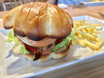 平日の12時前に行きました。ハンドバーガーにサラダとスープのセットを付けて1,800円。グリーンピースの冷製スープはコクがあって濃厚でおいしかったです。そしてメインのハンドバーガー。紙ではさんで食べることもできますが、ボリュームがあるのでナイスで切っていただきました。手の形をしたパンは淵がカリカリしていて、パン自体はふんわりしていました。ハンバーグはしっかりと固まっているように見えて、中はふんわり。ジューシーでとてもおいしかったです。お店の雰囲気も良く、ゆったりおいしい食事を楽しめました。