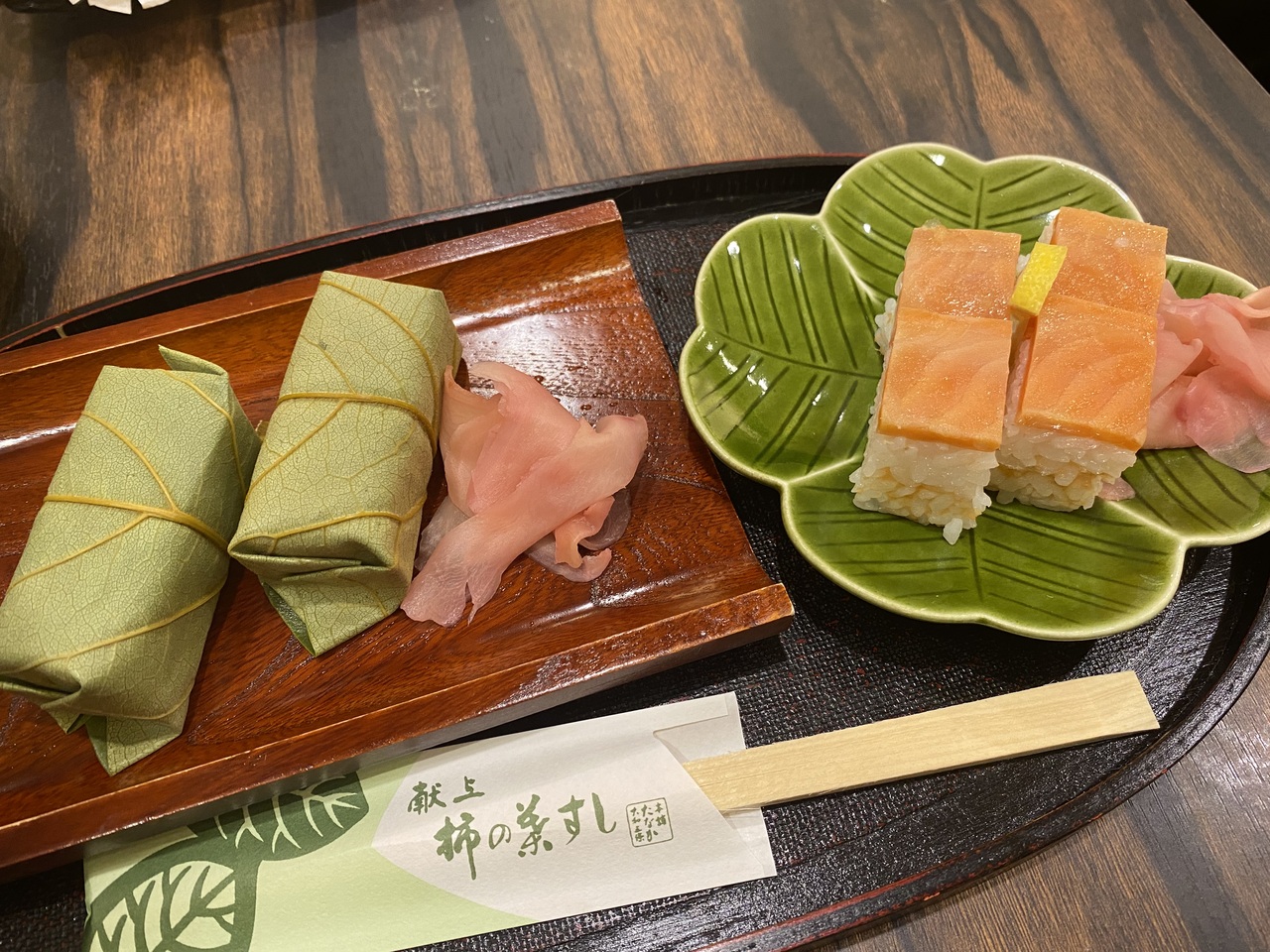 近鉄奈良駅のすぐ近くの柿の葉寿司のショップですが、奥に小さな食べるスペースがあります。鯖とサケ、とろサーモンの柿の葉寿司を注文しました。どれもとてもおいしかったです。