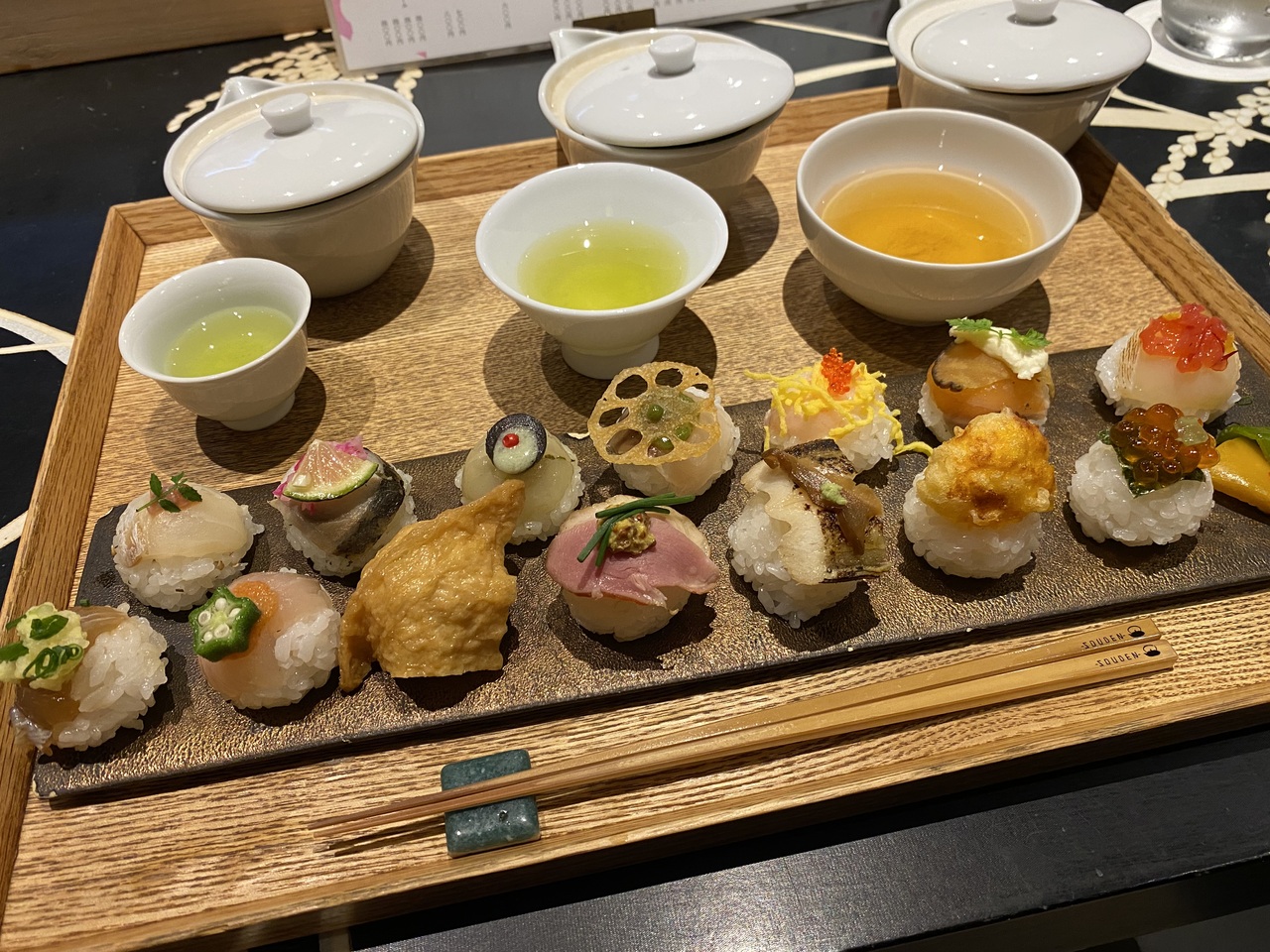 事前に予約して行きました。烏丸御池駅から歩いて7分ほどです。手毬寿司14貫と3種類のお茶飲み比べのセットにしました。手毬寿司もおいしかったですが、お茶の味わいにはびっくり。特に雁金茶は低音で入れると旨みが出てまるでお出汁のような味でした。温度を少しずつ上げて3回お代わりしました。温度でこんなに味が変わることに驚いたし、カウンターだったのでお店の方がいろいろ教えてくださって楽しかったです。
