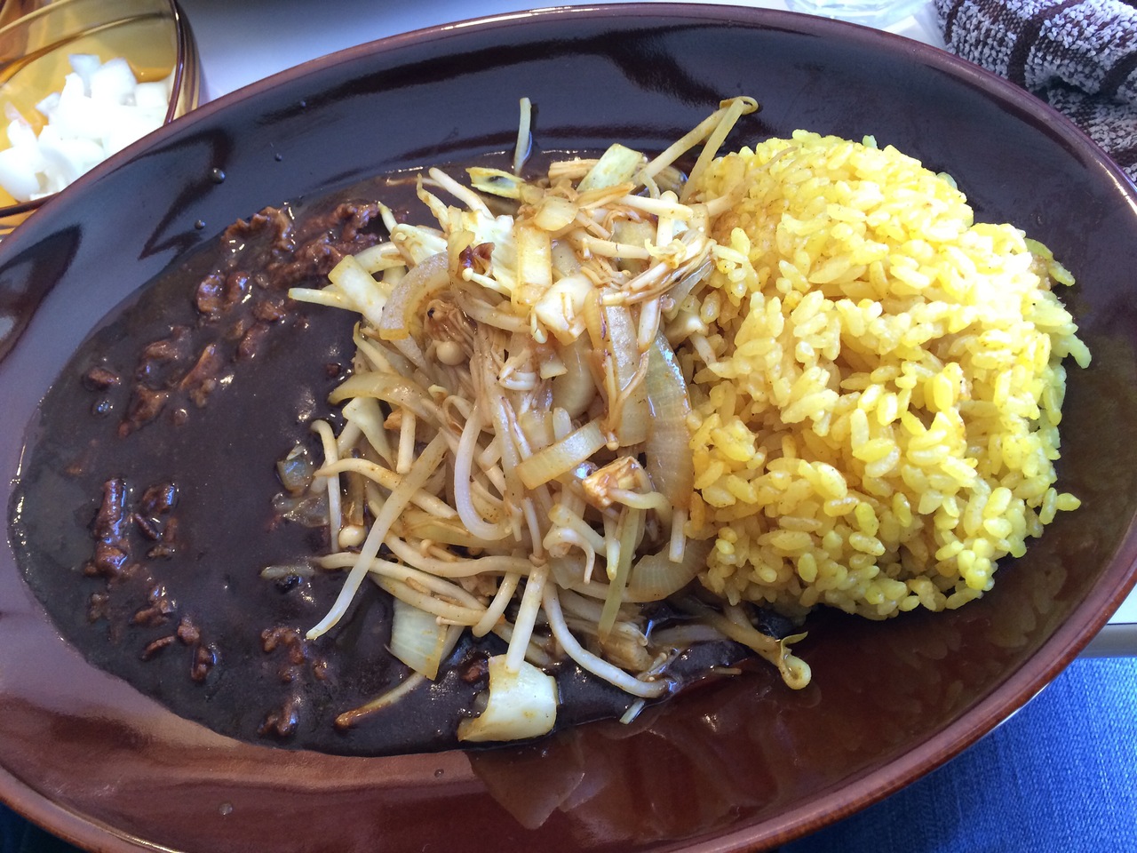新橋駅のSL広場のすぐ近くのニュー新橋ビルの中にある小さなカレー屋さんです。4人で奥の小さいテーブル席に座りました。ビーフカレーを注文。カレーと一緒に玉ねぎのピクルスが来ました。淡路島の玉ねぎだそうで玉ねぎの辛味が程よく抜けて美味しかったです。カレーに乗せて福神漬けの代わりにしました。カレーは黄色いライス、その横にもやしとキャベツ、そしてカレーがよそってありました。食べ始めは辛くないなと思いましたが、食べていくうちにだんだんスパイスが効いてきて美味しかったです。ボリュームもわりとあって1,000円でしたしおいしかったのでまた食べに行きたいと思いました。