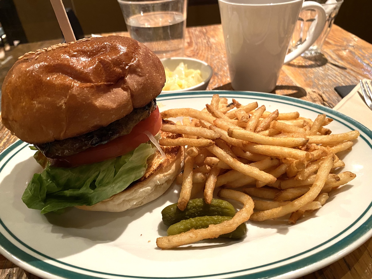 平日のランチに利用。平日だけどわりと人がたくさんいた。ランチのハンバーガーを注文。ドリンクも付いていてホットコーヒーにした。15時までおかわりできるとか。ハンバーガーにはハンバーガーを食べる紙もついていた。ハンバーガーもポテトもとてもおいしかった。お店の雰囲気もいいしまた来たい。