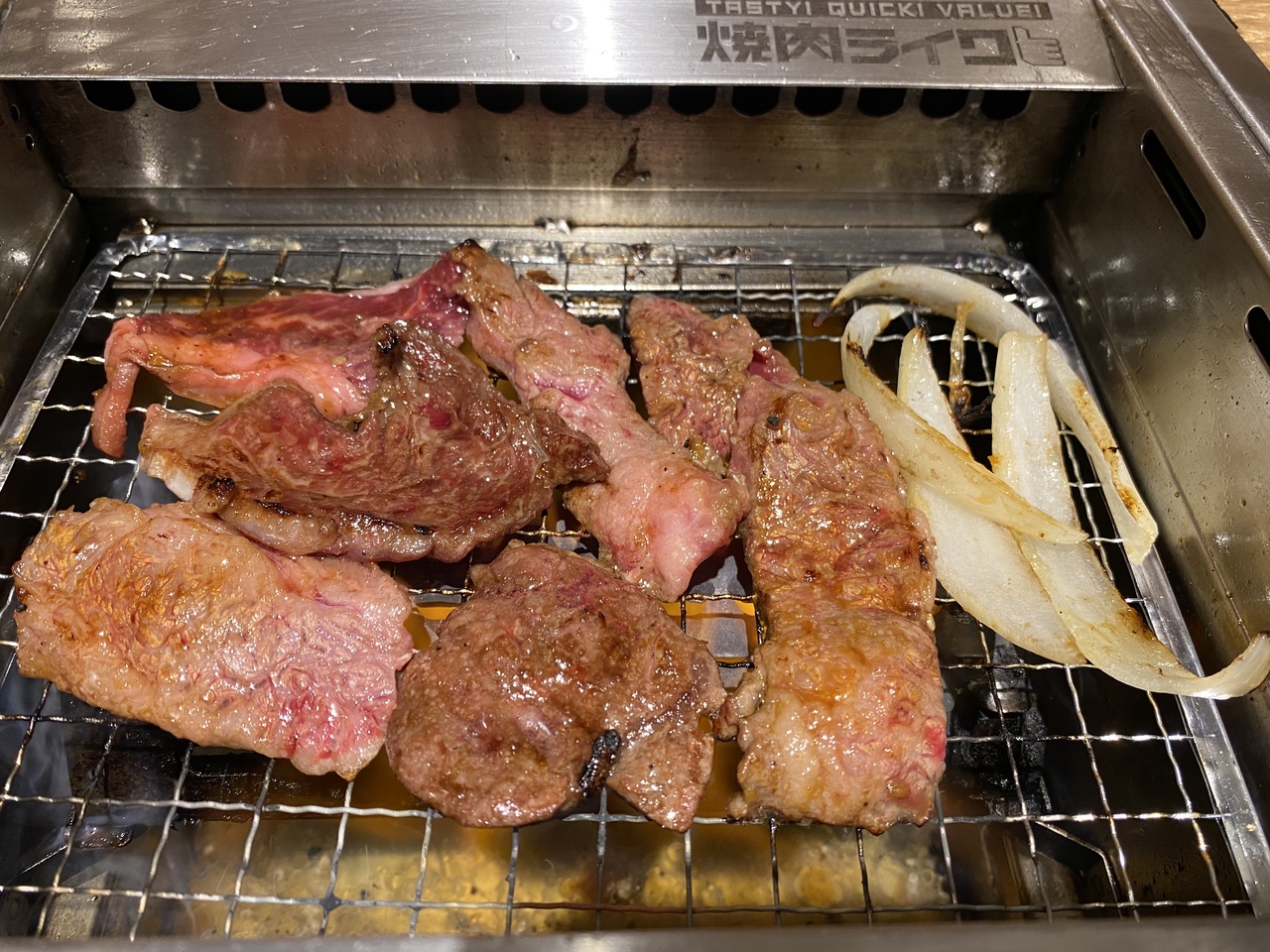一人焼肉店ですがいくつか2人用の席もありました。両側がアクリル板で囲われ、1人用のコンロがついている席に案内され、注文は全てテーブルにあるタッチパネルから。注文したら自分で着火ボタンを押して火をつけ、テーブル番号を呼ばれたら注文した品を取りに行きます。ハラミとカルビのセットを注文しました。肉を一気に網に乗せて焼き、焼き上がったら好みのタレをつけてキムチと一緒にご飯に乗せて食べました。ワカメスープもついています。気軽に一人焼肉できて安くておいしくて大満足でした。