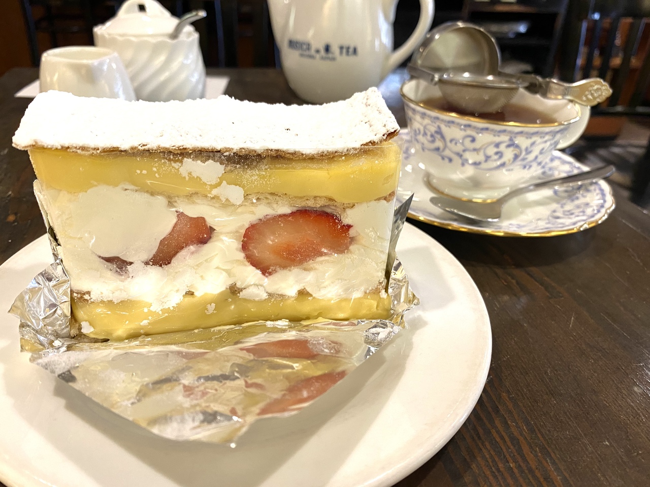原宿のクリスティーでミルフィーユと紅茶を。カスタードと生クリームたっぷりのミルフィーユは甘すぎずとてもおいしかったです。紅茶はポットでくるので3杯くらい飲めました。イングリッシュモーニングもやっているので今度はそれを食べてみたいです。