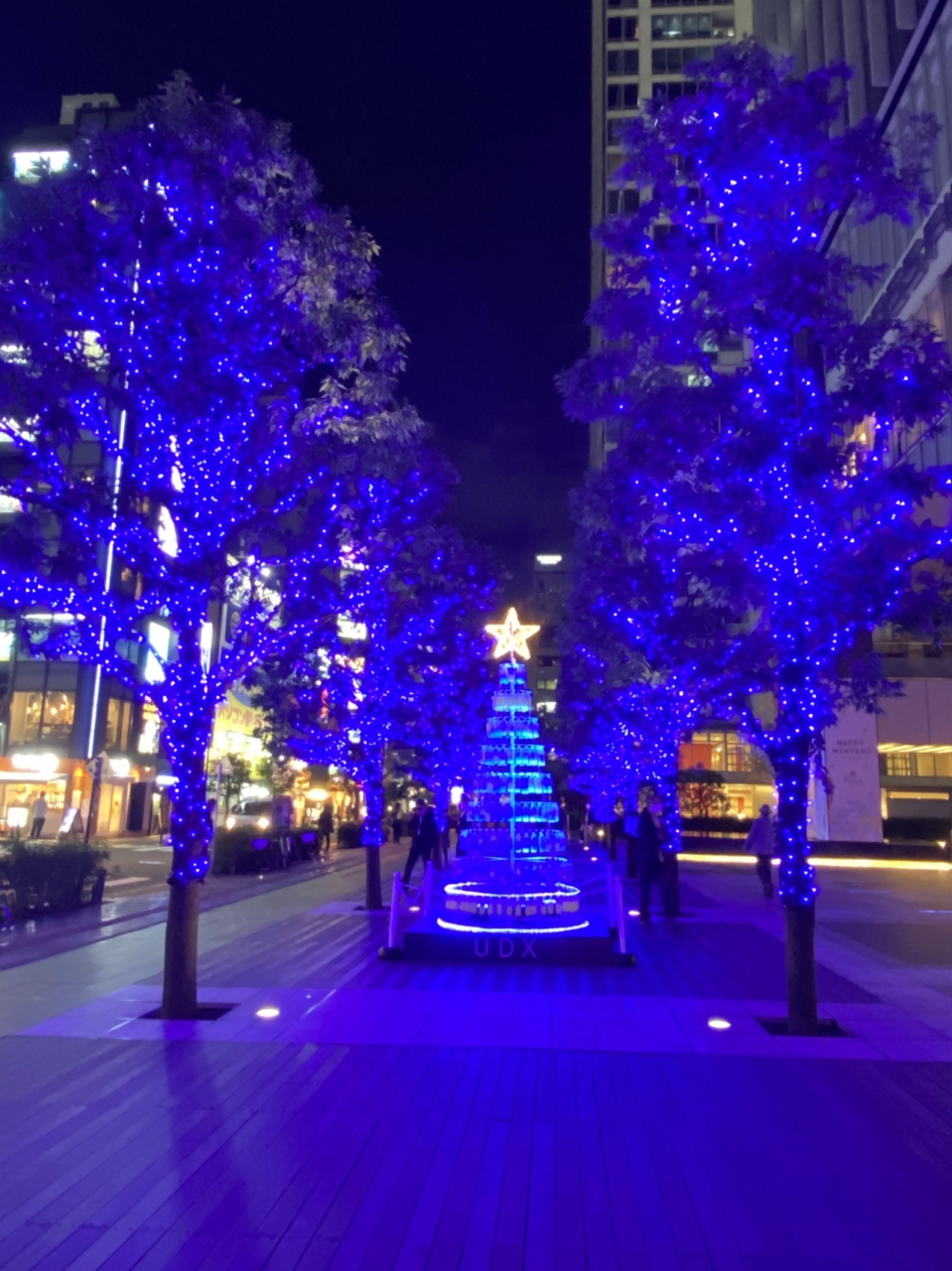 UDXの木々の電飾が夜になると黄色と青に光っていました。10分ほどでそれぞれの色に変わります。クリスマスツリーはずっと青でした。こじんまりとしたイルミネーションですがきれいでした。