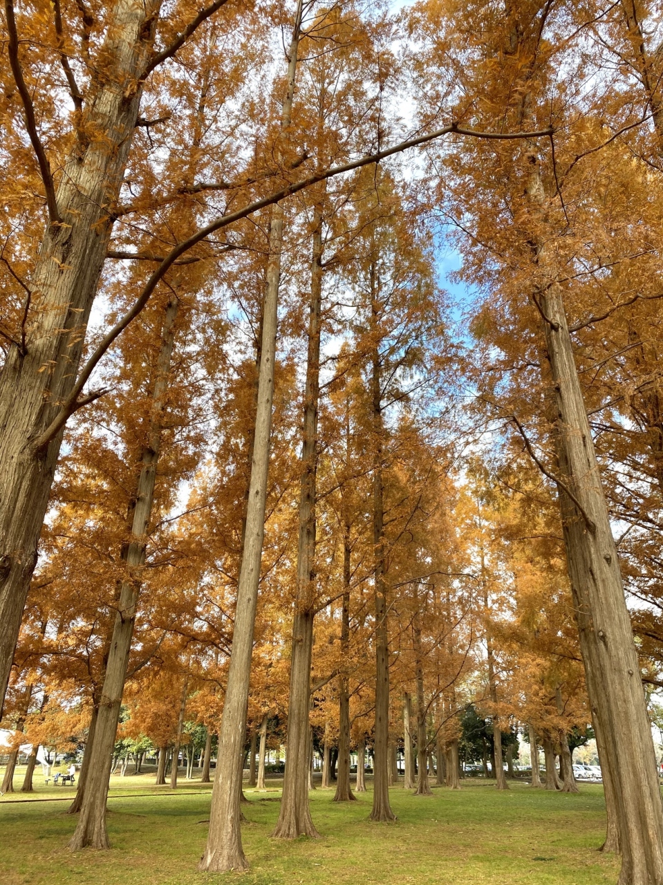 メタセコイアの紅葉を見に行きました。金町駅前からバスで5分ほどです。バスを降りてから5分ほど歩くと水元公園に到着します。メタセコイアの森は向かって左側にありました。日本ではないどこか外国に来たような風景でした。広々した芝生の広場や水場、ドッグランもありました。散歩したりジョギングしたりとわりと人がたくさんいましたが広いのでゆったりできました。