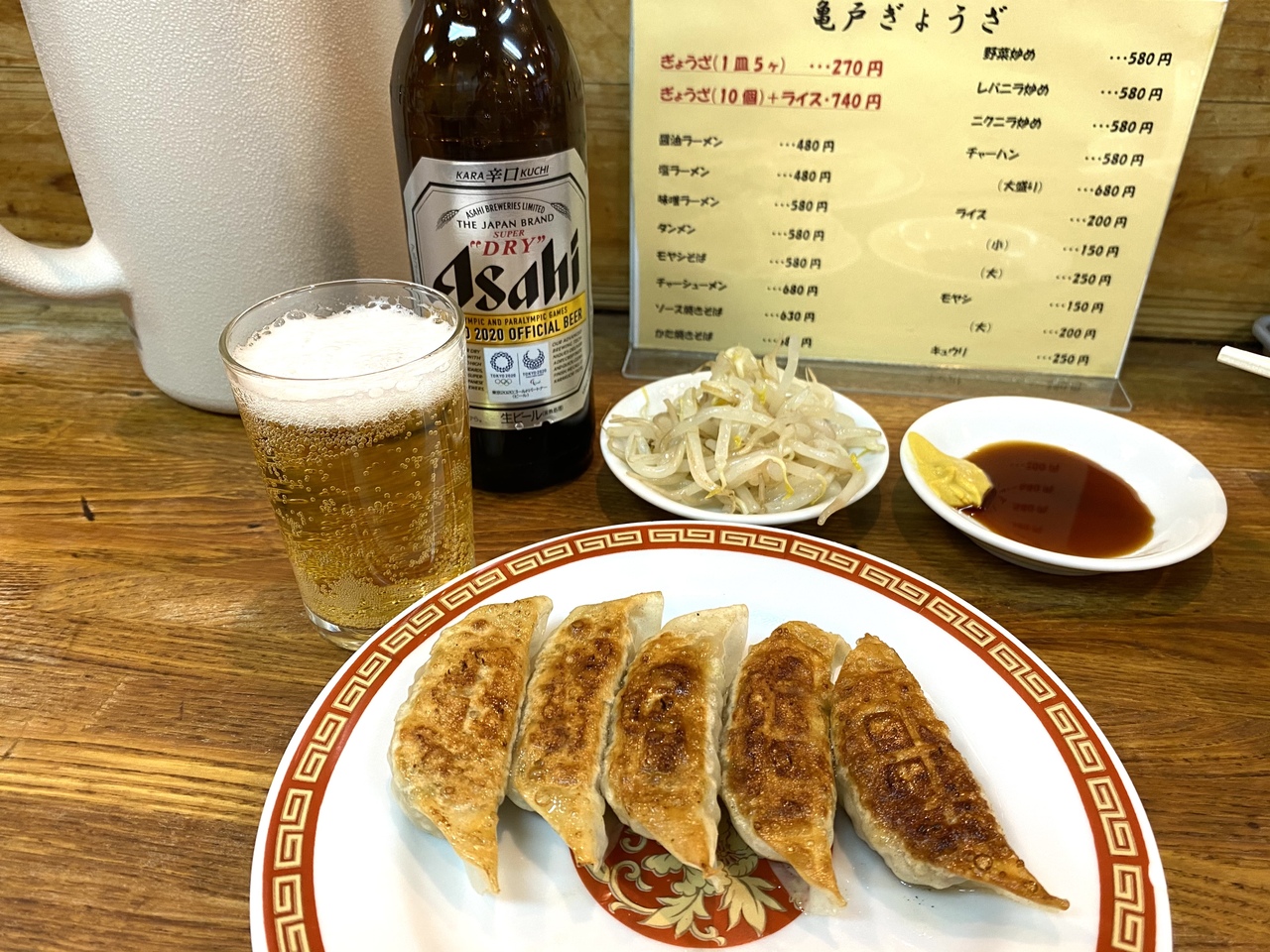 お昼を食べに亀戸ぎょうざ両国店へ。餃子1枚、チャーハン、ビール小瓶を注文。もやしがサービスで出てきます。もやしと餃子とビールの三角食べが最高においしくてあっという間にビールを飲み終えてしまいました。チャーハンも一口食べて「そうそう、この味じゃなきゃ」と大満足のおいしさでした。