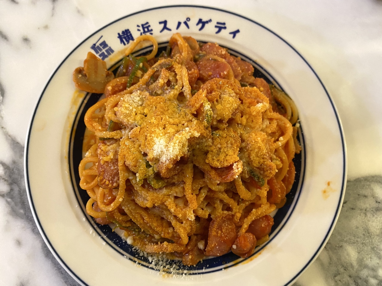 お昼に横浜ナポリタンを。みなとみらいの東急スクエア1の地下1階にあります。エスカレーターを降りてすぐ右の場所です。横浜ナポリタンと紅茶を注文しました。太めのもちもちしたスパゲティにたっぷりのナポリタンのソースがしっかりと絡んでとてもおいしかったです。ソーセージやピーマン、振りかけられたチーズもどれもちょうどよく、一口食べた瞬間にジワッと旨味が広がりました。ナポリタンはもともと好きですが、このお店のナポリタンはとても好きな味でした。