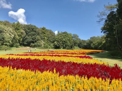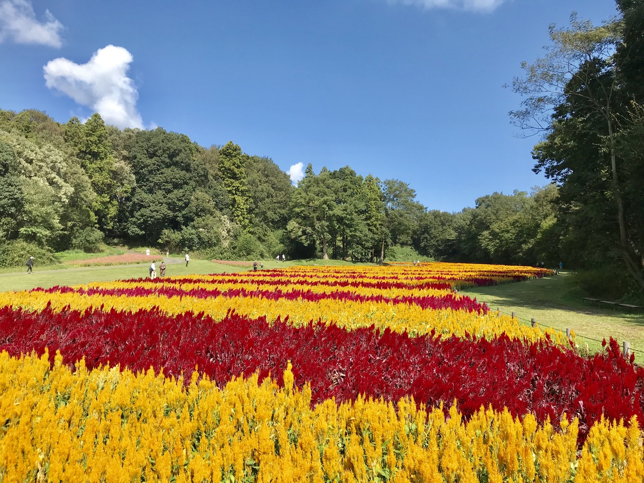 土曜日の10時15分くらいに着くように行きました。最寄りの森林公園駅から土日だけ出ている直通バスで10分もかかりませんでした。公園の南口に到着します。入り口の券売機で入場券を買って入場時に係りの方に渡しました。羽毛ゲイトウを見るのが目的だっので入り口から向かって右側へ進みました。羽毛ゲイトウまでの案内板が途中途中にあるのですぐわかりました。森林浴をしながらゆっくり歩いて20分ほどで、芝生の広場の向こうにゲイトウの畑が見えてきました。台風の影響で手前の畑のゲイトウは倒れ気味でしたが、奥の畑のゲイトウはしっかり頑張ってまっすぐ咲いていました。お天気も良く色鮮やかな赤と黄色のゲイトウを楽しめました。すぐ近くに赤そばの花も咲いていました。今回はゲイトウだけしか見ませんでしたが、季節でいろいろな花が咲くようなので時期を変えてまた行きたいです。