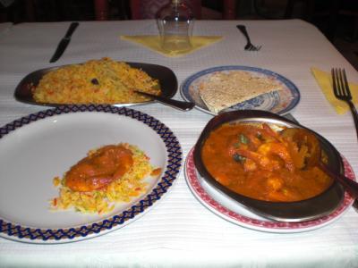 シーフードカレー、ビニヤリ(ピラフみたいなご飯)、ビールで12.25ユーロ。おいしい!超お勧め! リベルダ―デ通りからRua dos Condesの道沿い。