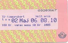 窓口で購入すれば、既に有効期日と時間迄が印字されてますので、普通の切符と同じように改札を通過できます。72時間180SEK.- 旅行時期