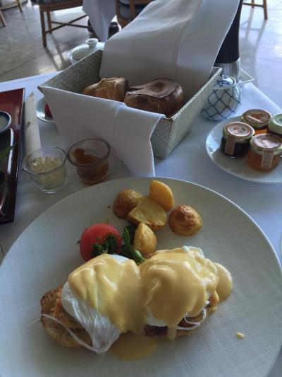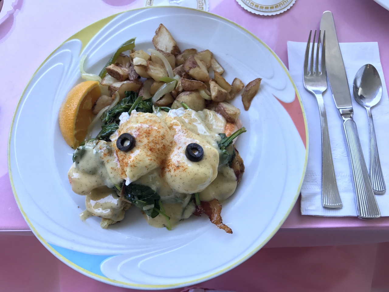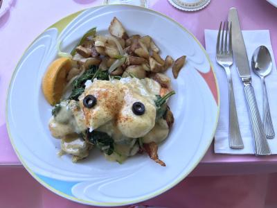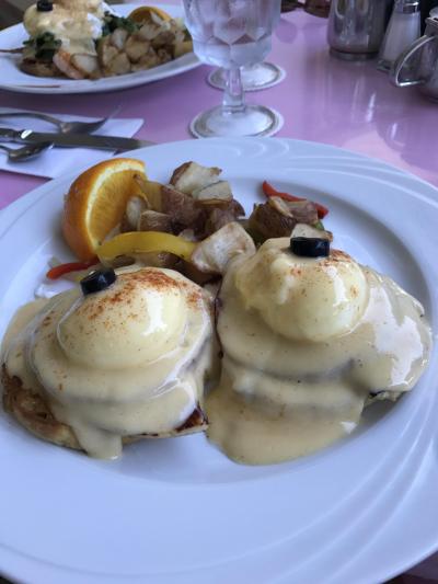 私は、カニクラブ入りのエッグベネディクトに、ポップオーバー。