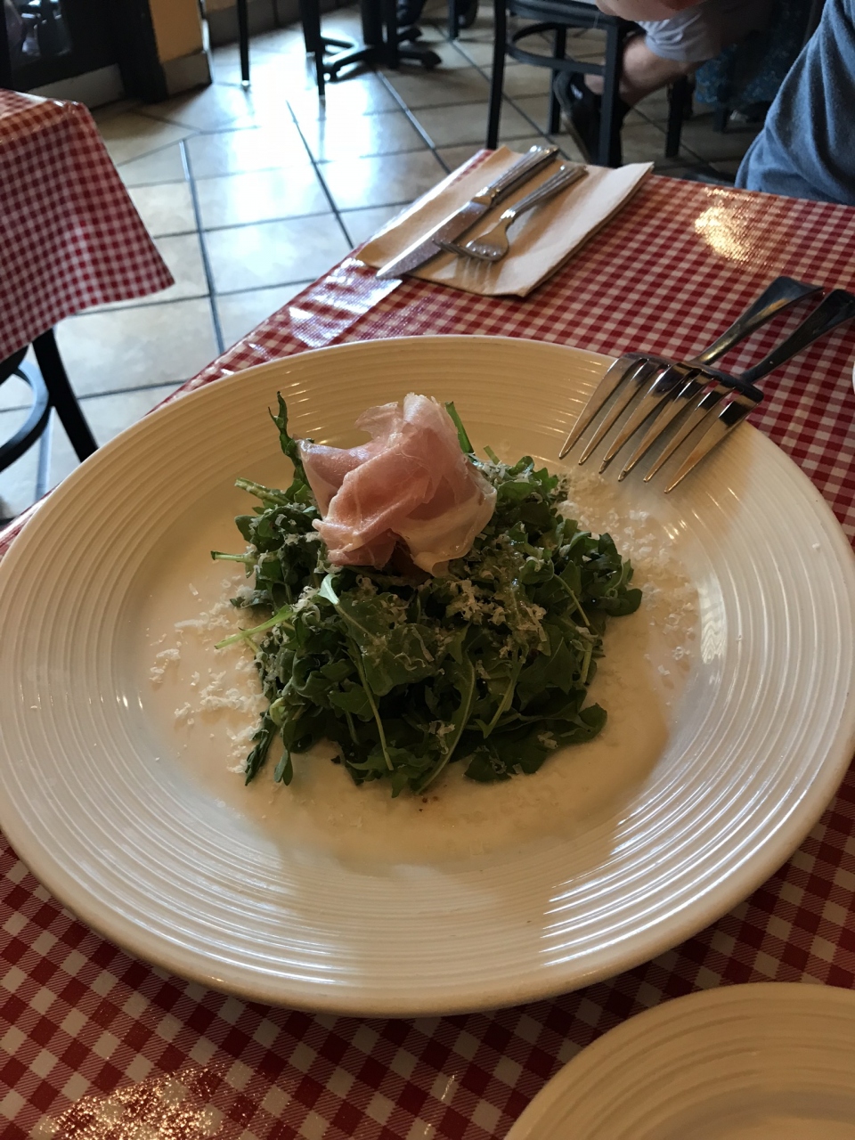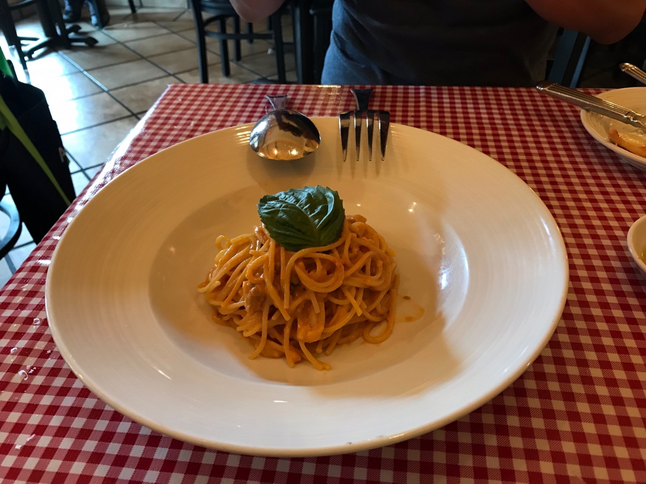 前菜にルッコラ生ハム、マルゲリータにウニのパスタ、ティラミスを食べましたが、