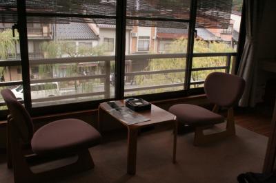 10畳の和室に柳並木が見渡せる窓際に椅子とテーブルの席が付いて(トイレ・洗面所が付き)二人で泊まるのに広々とゆったりと過ごせました。また窓から見える柳並木は、朝・昼・夕・夜とそれぞれに情緒があり、川沿いを外湯めぐりや散歩で歩く人のカランコロン…といった下駄の音も耳に心地よかったです。