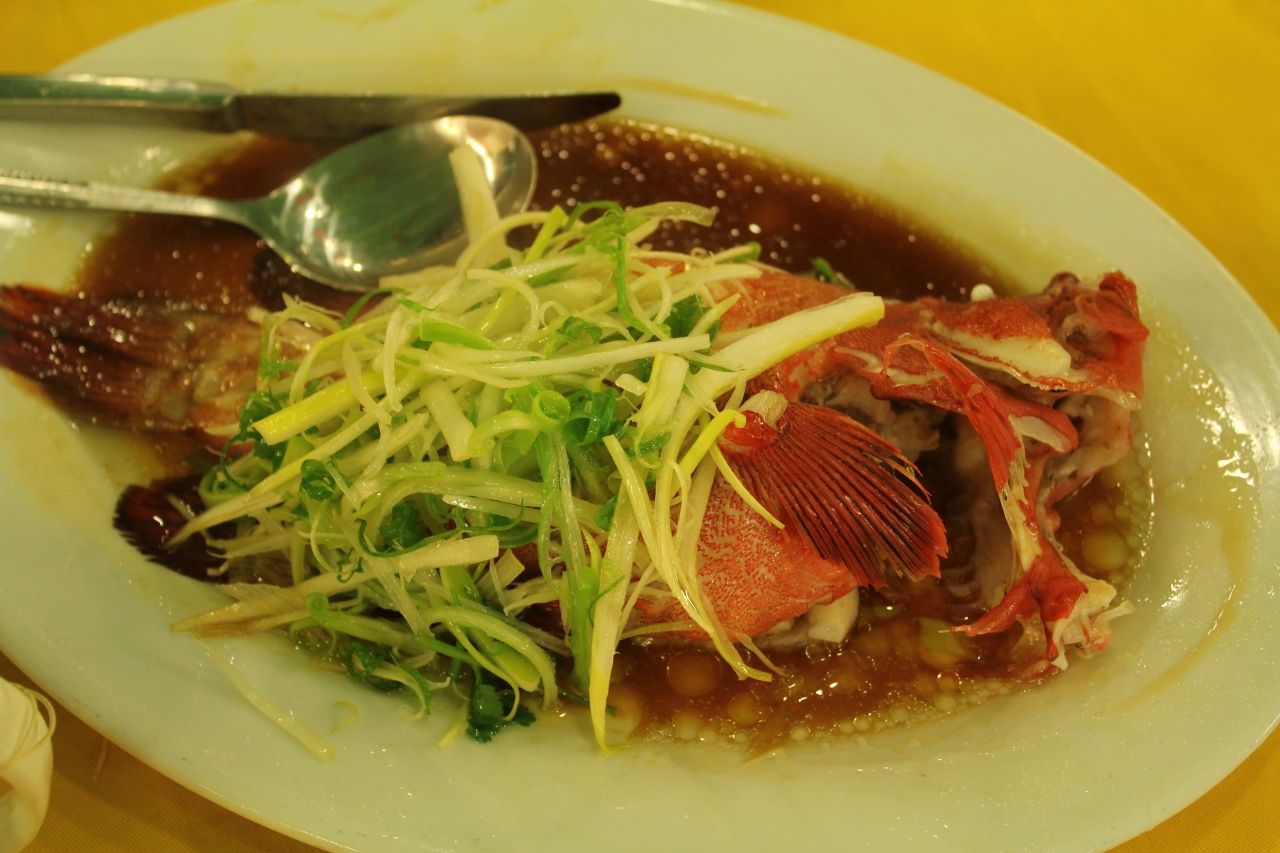 2人分の小さめのお魚(Garoupa)を選んで料理をしてもらいましたが、これが一皿で800HK$!何度も確認した時に指し示されたカードには50$。でも後で写真をよく見ると“両37.5g”(37.5gにつき?の意)との表示も…。(その計算でいくと約6kgのお魚(Garoupa)だったという事になります)お魚を注文しようと思われる方、要注意!です。