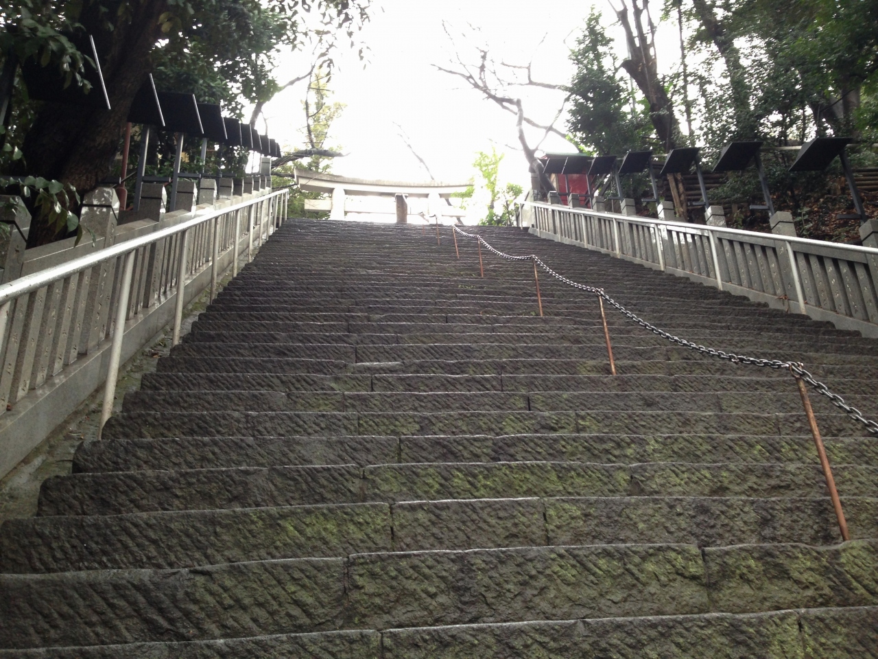 『出世の階段』のいわれは、江戸時代、将軍徳川家光が山上にある梅が咲いているのを見て、「梅の枝を馬で取ってくる者はいないか」と言ったところ、讃岐丸亀藩の家臣(曲垣平九郎)が馬で石段を駆け上がって梅の枝を取り、馬術の名人として全国にその名を轟かせた、という逸話から来ているそうです。(その他にも3例の成功例があるそうです)
