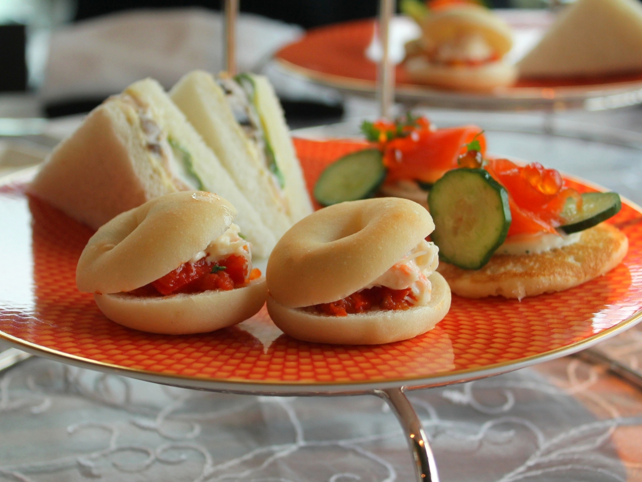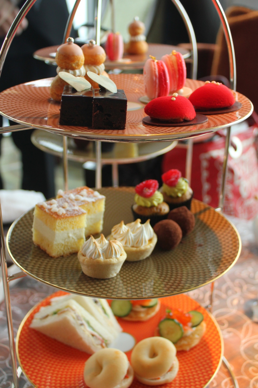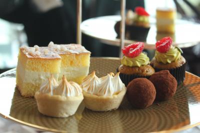 フランス・リモージュ焼レイノー社の食器の3段トレーにのせられたスイーツ&サンドイッチやスコーンは、品のいいお味。お茶、コーヒー(温・冷)はカップ or グラスサービス。