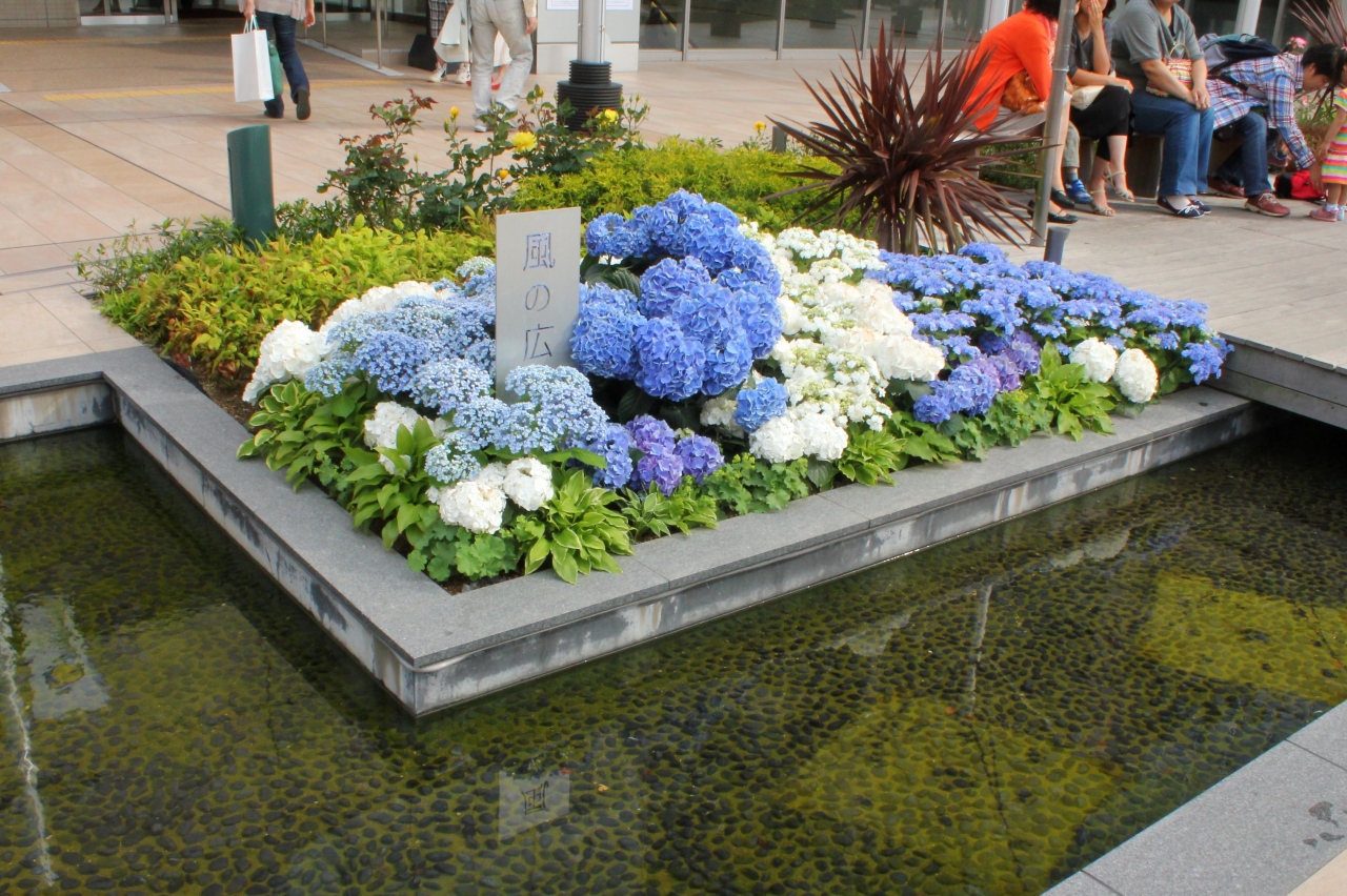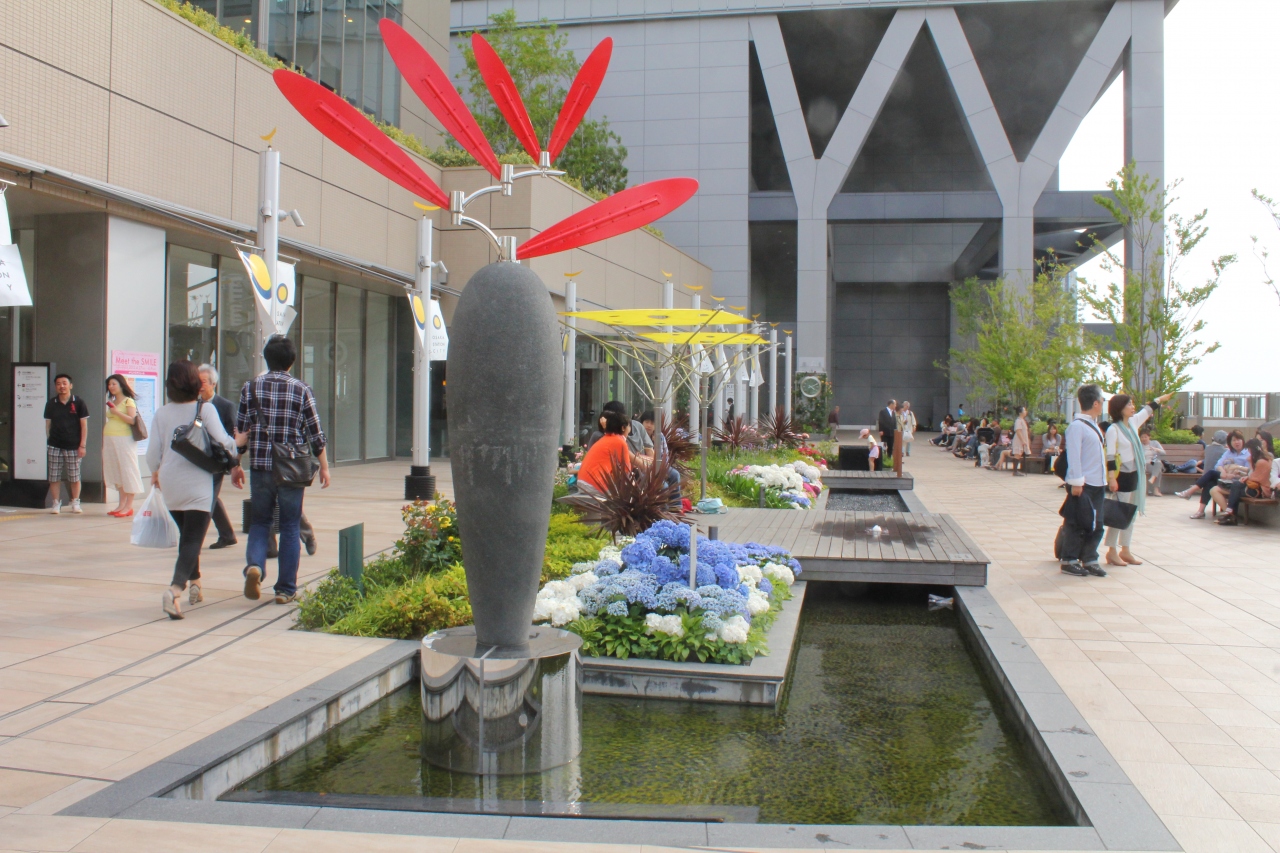 モニュメントに、ウオータースペース。時期それぞれのお花も咲いています。