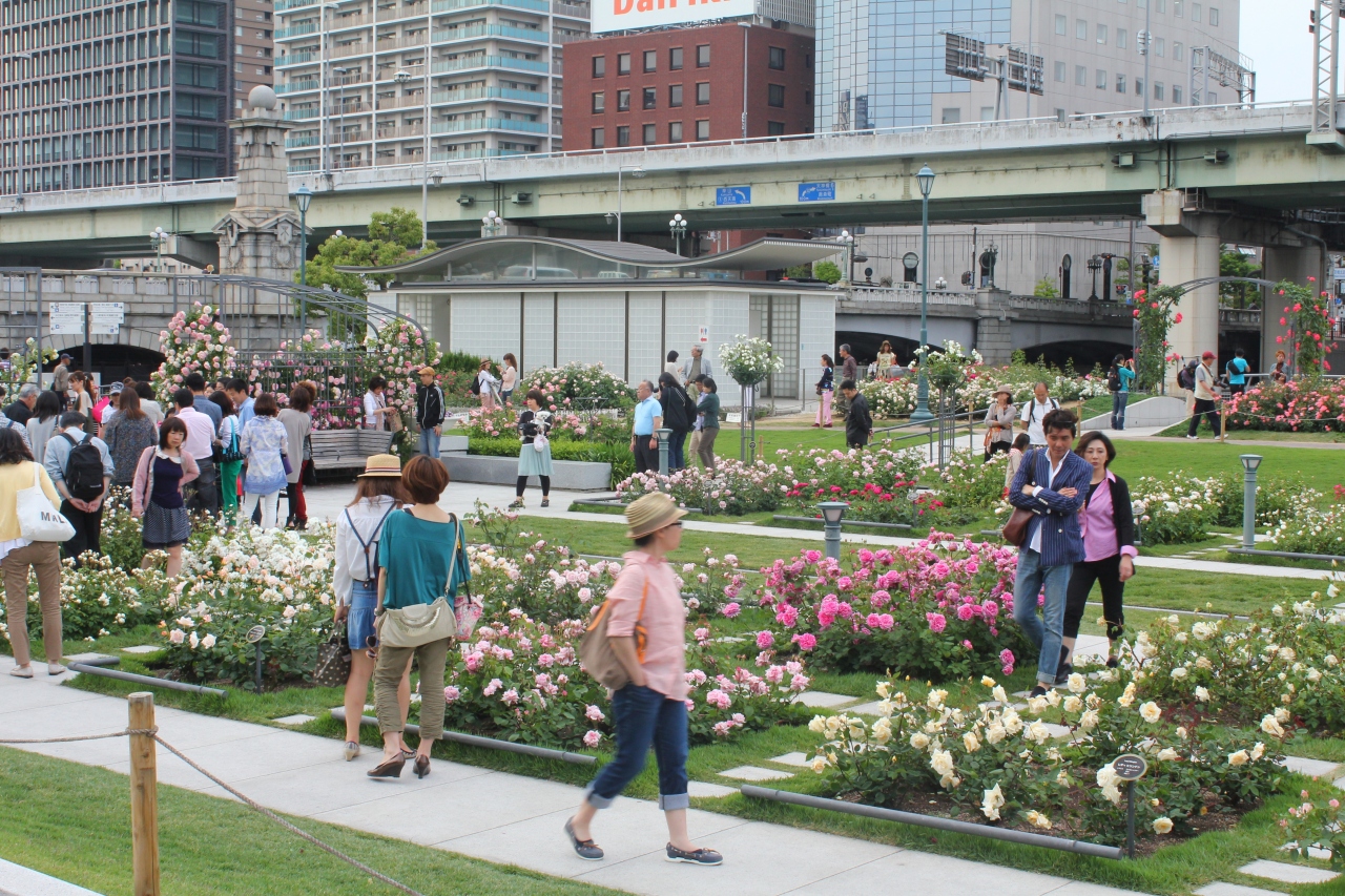 周囲一帯はオフィス街。大阪の真ん中にこんなステキなバラ園がさり気なくあるなんて、とてもうれしくなります。