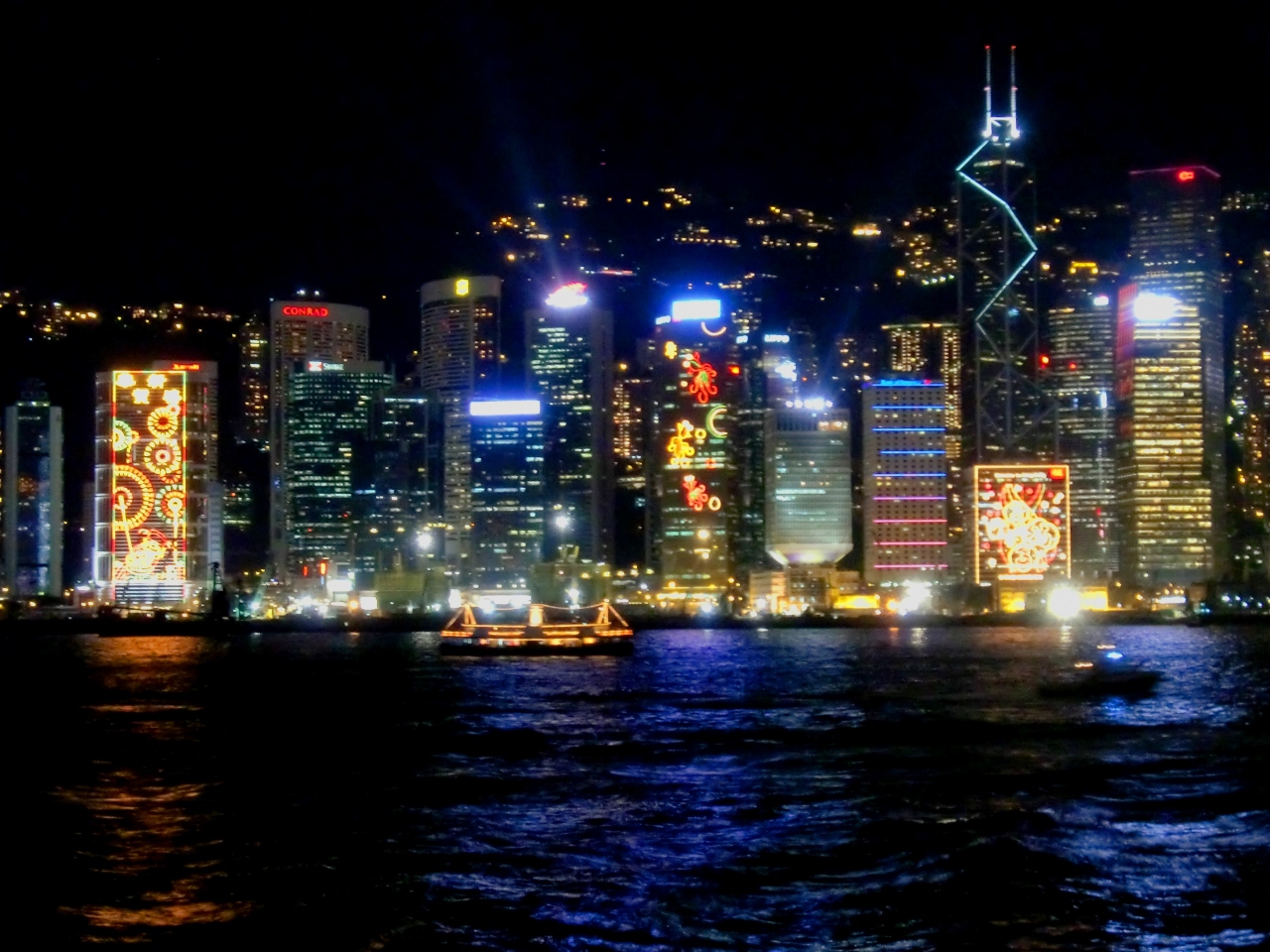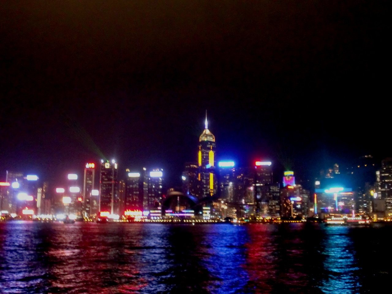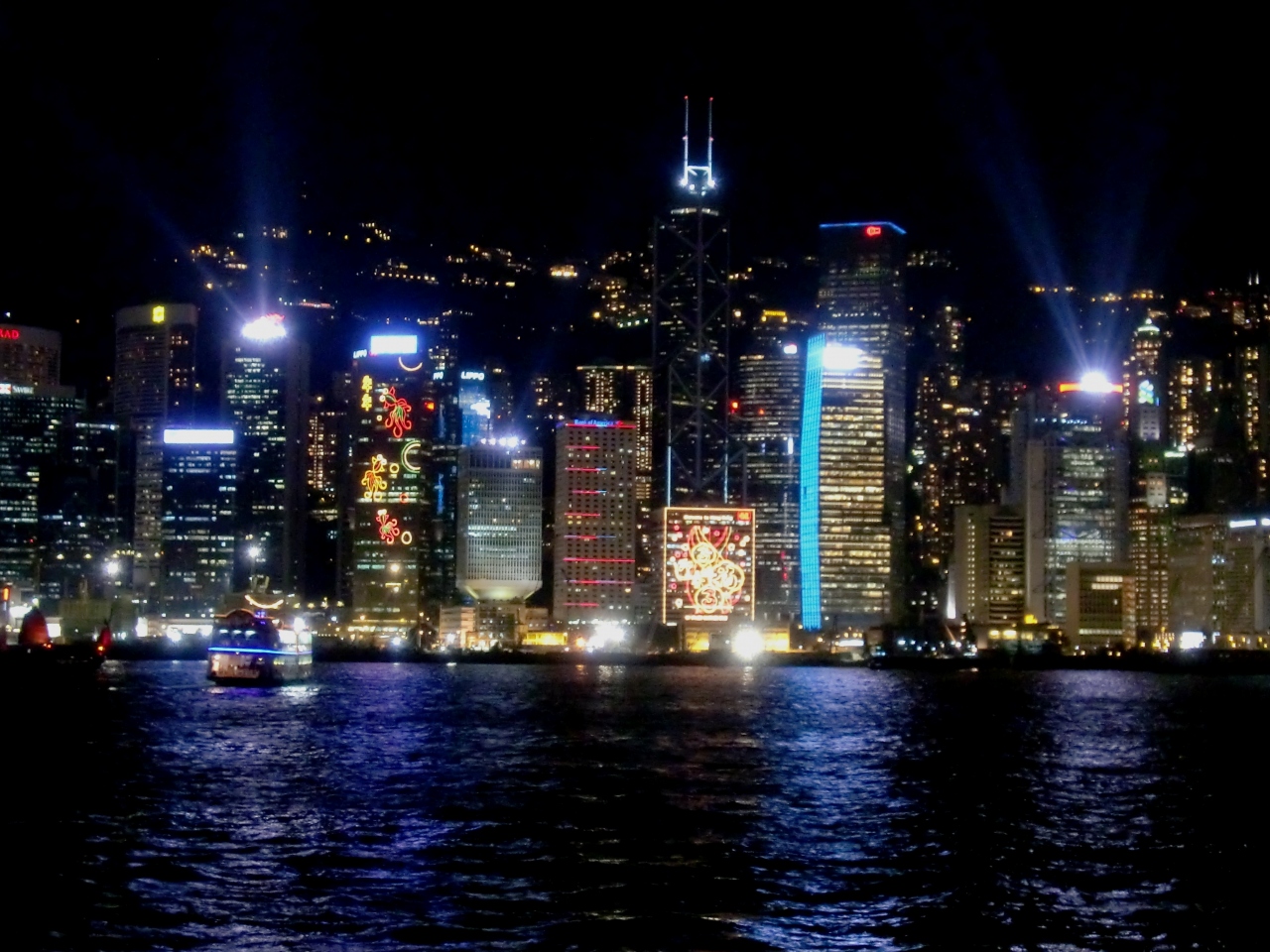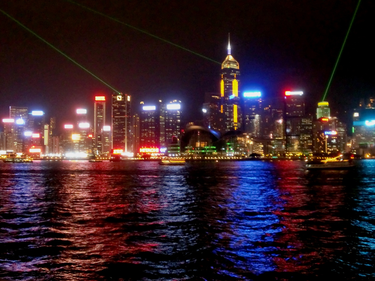 ビクトリア・ハーバーで、午後8時より毎晩行われる、光と音のイリュージョンー「シンフォニー・オブ・ライツ」。