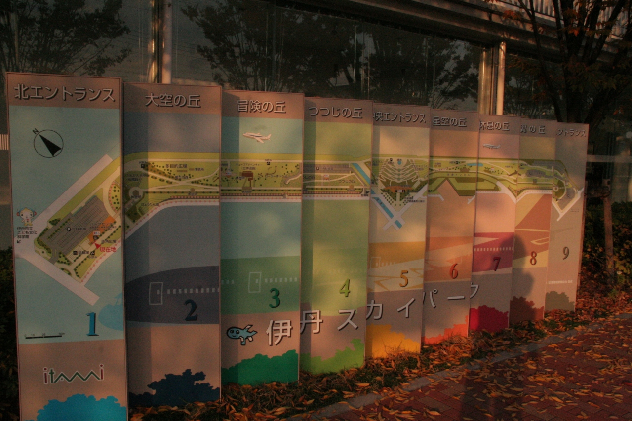「伊丹スカイパーク」は、大阪伊丹空港の航空機騒音を和らげる緩衡緑地として国と県と市の3者が協力して平成5年から整備され、平成20年7月に完成した伊丹空港の走路のすぐ横に隣接する9ヘクタール、長さ1.2キロメートル、幅80メートルの広大な公園です。