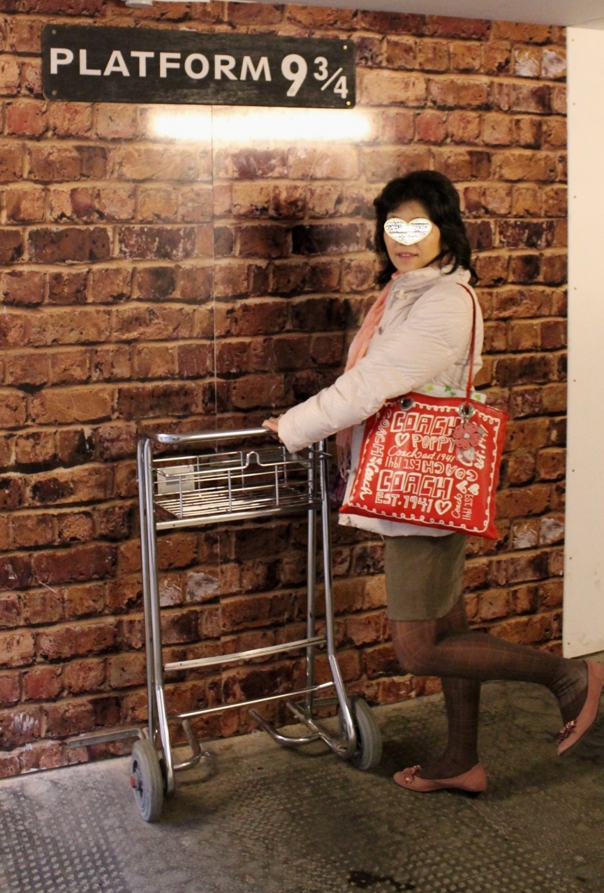 最初は、お目当ての9と3/4番線は実際のホームにあると信じて探していましたが、実はホームの外の一角に“9と3/4番線”の記念撮影場が設けられていました。
