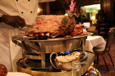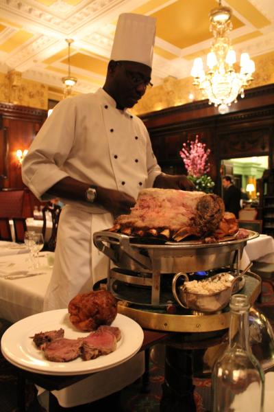 紳士クラブの頃の格調ある雰囲気の中、アンテイークの銀のドームのトロリーで運ばれてくる大きなローストビーフ