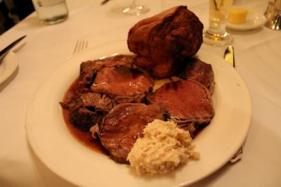 有名なローストビーフは、アンテイークの銀のドーム型のトロリーに乗せられたまま、シェフがテーブルまで運び、目の前で大きなローストビーフの塊から好みの焼き具合の部分をカットしてくれます。