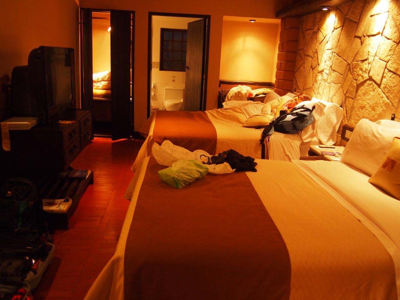 クスコから4335mのラ・ラヤという峠を越え、温泉で足湯をしたりしてもうすっかり暗くなってから到着しました。ロビーにはコカ茶が用意されていました。(いつでも飲める状態です。)