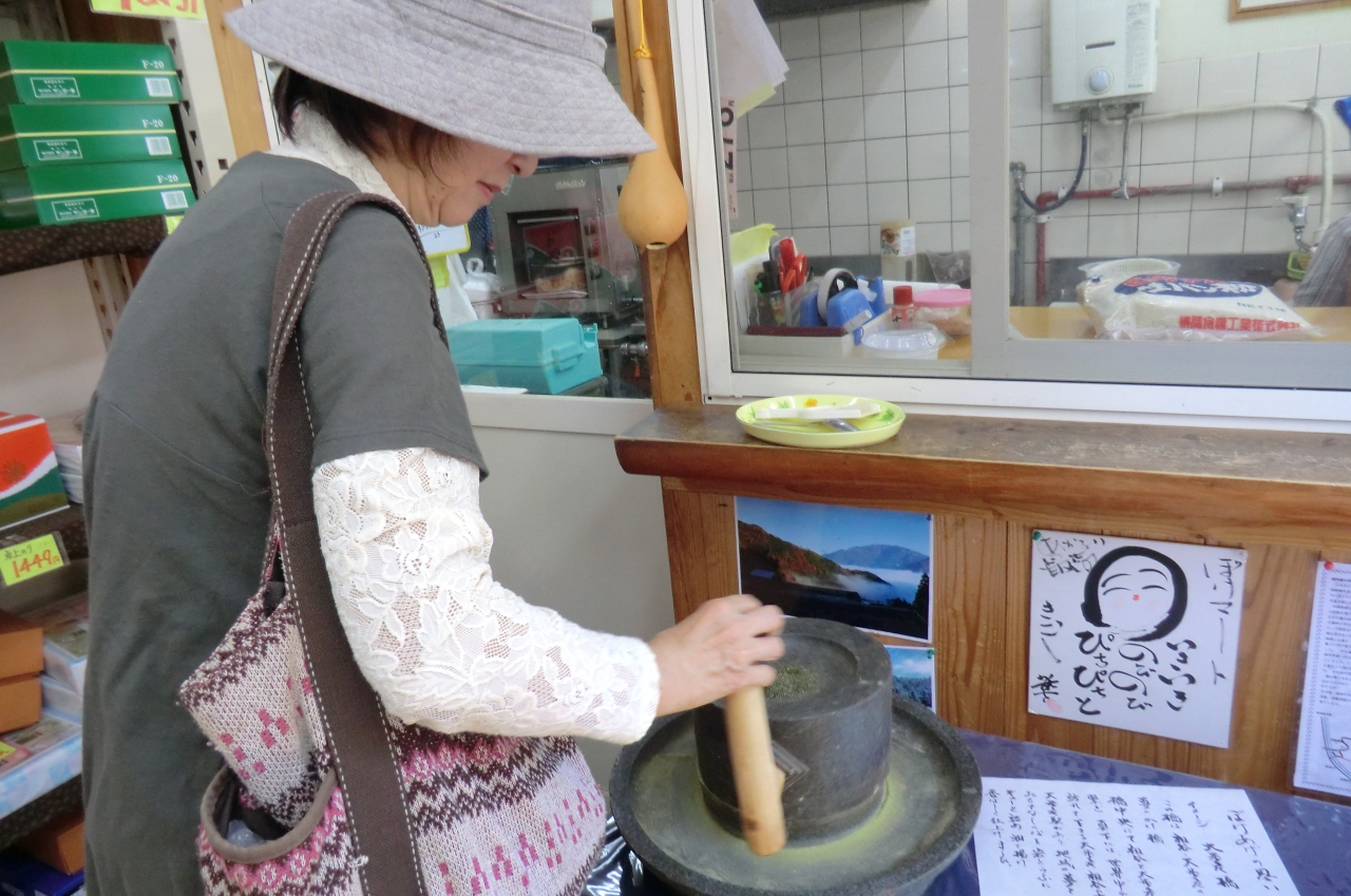 店内では、豆腐,揚げ物、おそば、地元野菜など、近くの人が生活のために利用する商品が並んでいました。