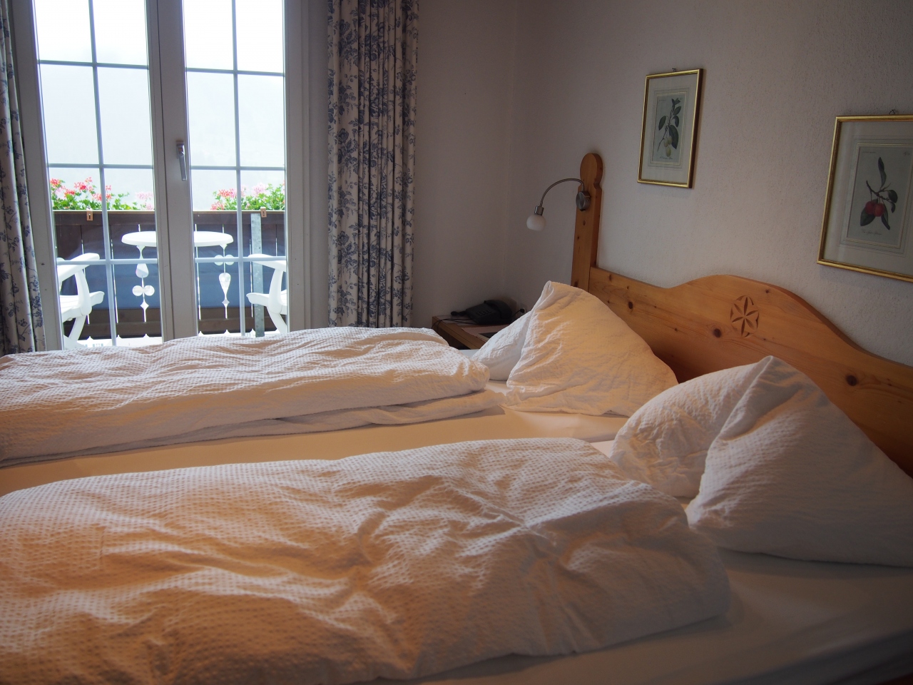泊まった部屋は新館の4階。ダブルルームですが広くてスーツケースを2つ広げてもまだ余裕がありました。ベランダがあり、正面にはマッターホルンが・・・・・