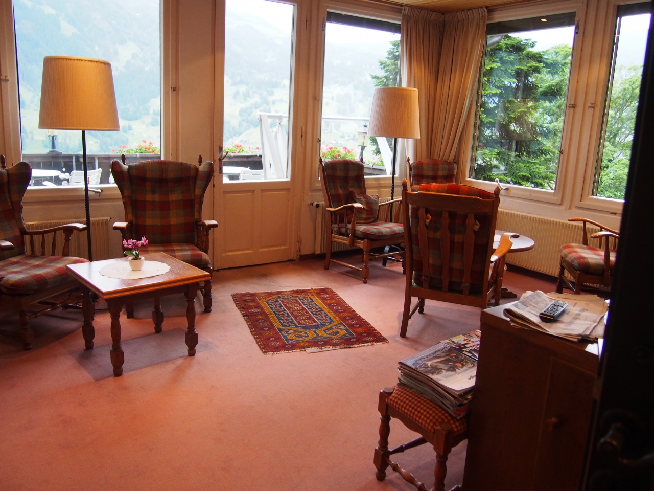 山側の中腹にあるので、アイガー側の部屋のベランダは、正面にアイガーやその他の山群があり、右側は登山電車や牧草地が広がっていてロケーション抜群です。