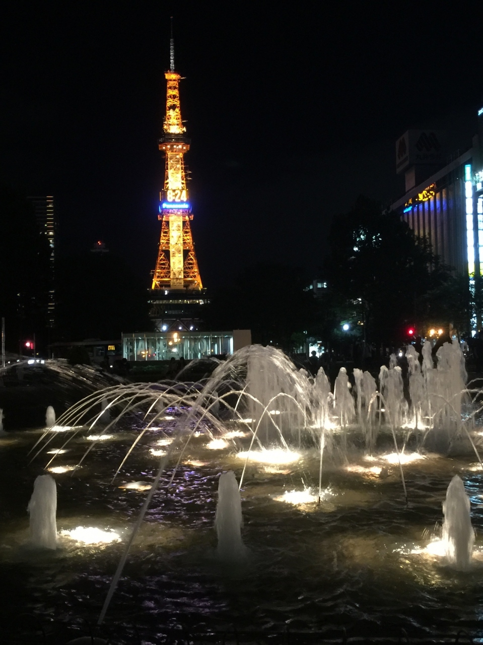 夜にホテルを出てブラブラと大通公園を散策。さすが北の大都会・札幌の市民の憩いの場。テレビ塔のネオンは綺麗で、噴水もライトアップ。夜のデートスポットにはオススメですね。