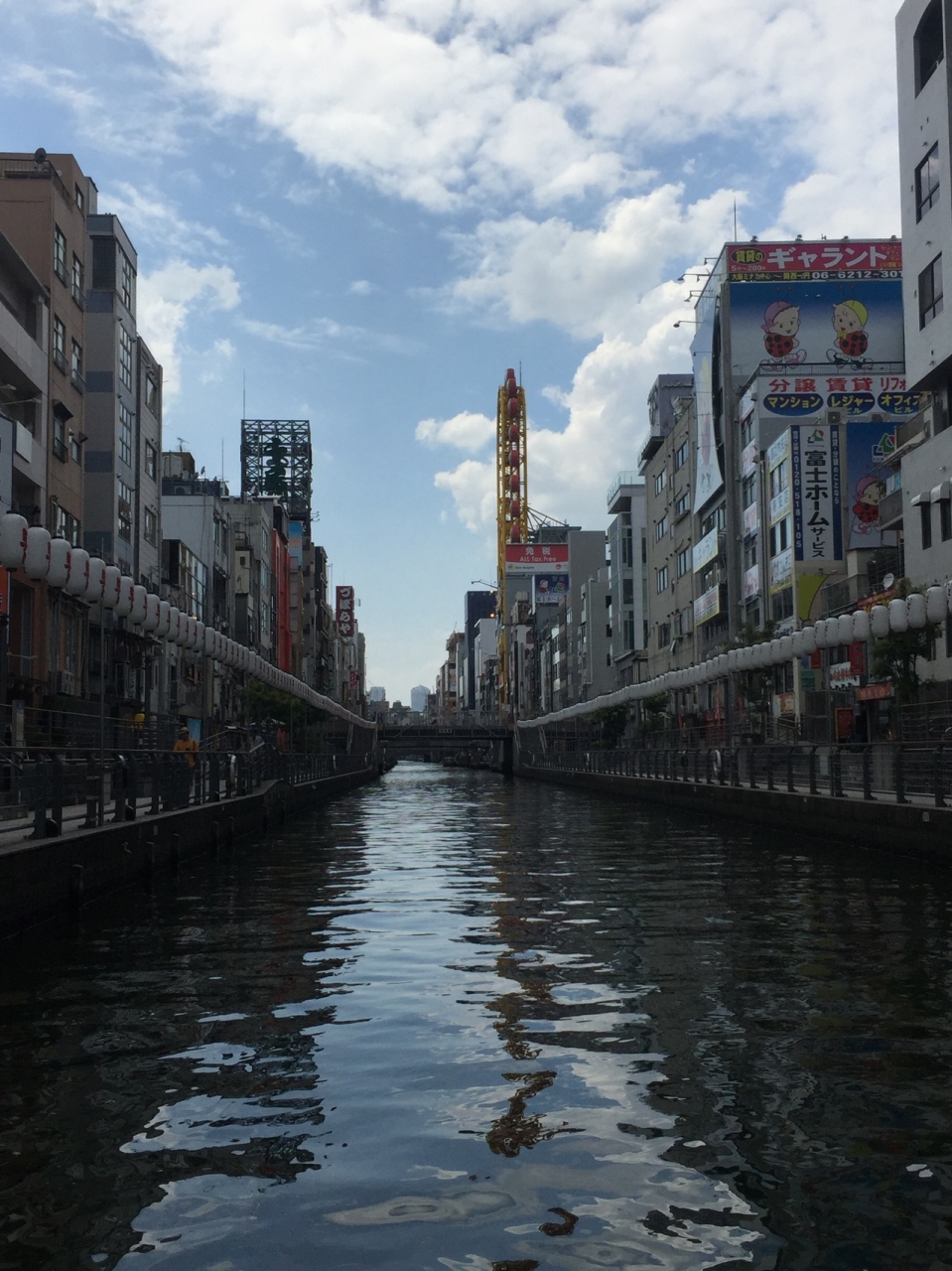 大阪城公園からの水上バス「アクアミニ」に乗ると、川からミナミの街並みを眺めることができます。しかし川幅の割には「アクアミニ」以外の遊覧船の数も多いですね。川には遊歩道まで出来たので、川幅は一層狭くなった印象です。
