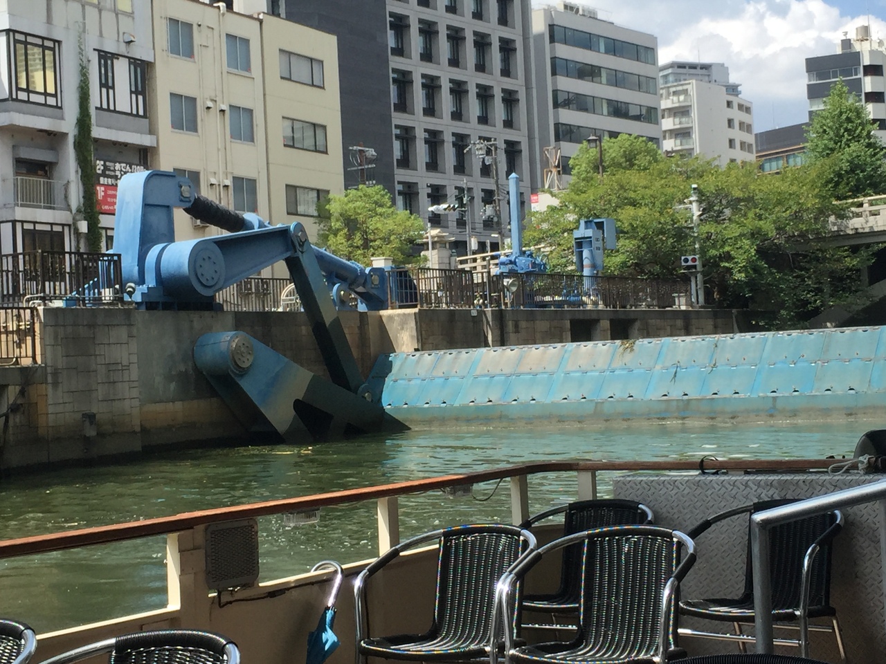 川は普通上流から下流に流れますが、この川は逆に上流側の水位が低いため、自然のままだと逆流するとのこと。そこで川の途中に大阪市管理の水門があり、そこで逆流を防ぎます。
