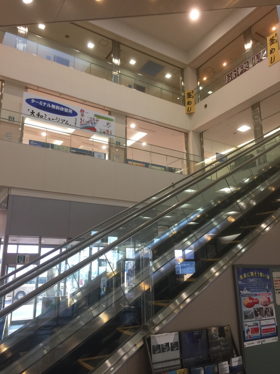 松山方面や江田島方面のフェリーが発着するターミナル。JR呉駅からは、通路を通って徒歩で約五分。アクセスは悪くありません。その途中からちょっと横にそれれば大和ミュージアムと、徒歩での移動でも観光にも使えます。