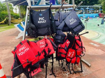 いたるところにライフジャケットが置いてあるので、どこででも借りられる。...