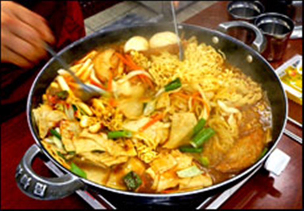 トッポギ(餅)が見えないくらいに、マカロニ・おでん(油揚げみたいなもの)・揚げ餃子・ゆでたまご・ラーメン・等などが入った鍋が目の前に運ばれて・・