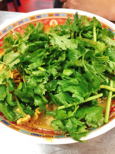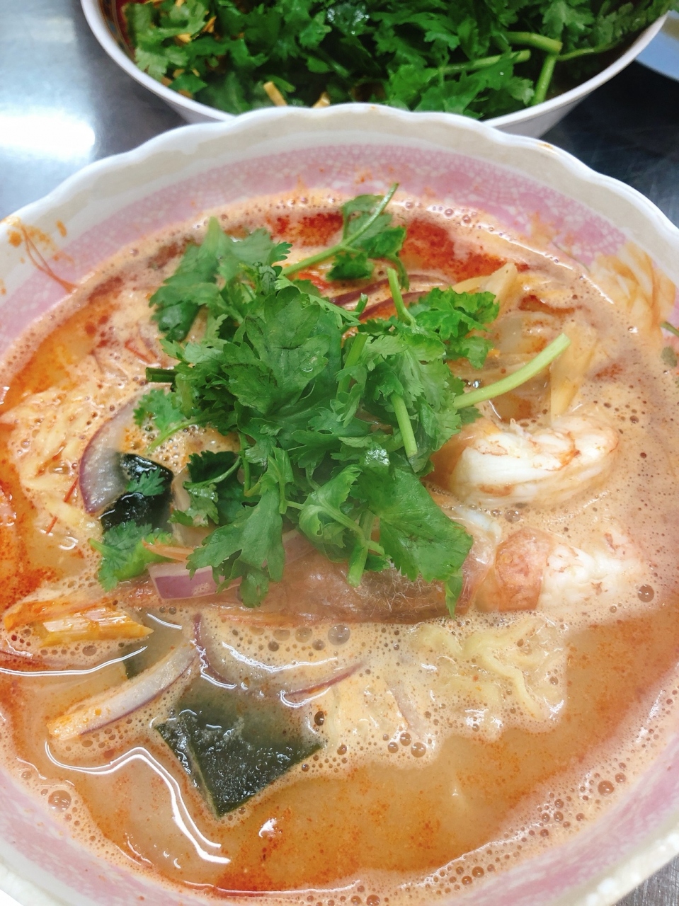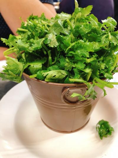 パクチーバケツというのがあって、バケツにぎゅうぎゅうに詰め込まれたパクチーを注文できます。トムヤムクンラーメンを頼んで、パクチー増し増しにしました。パクチー好きには嬉しいメニューです。