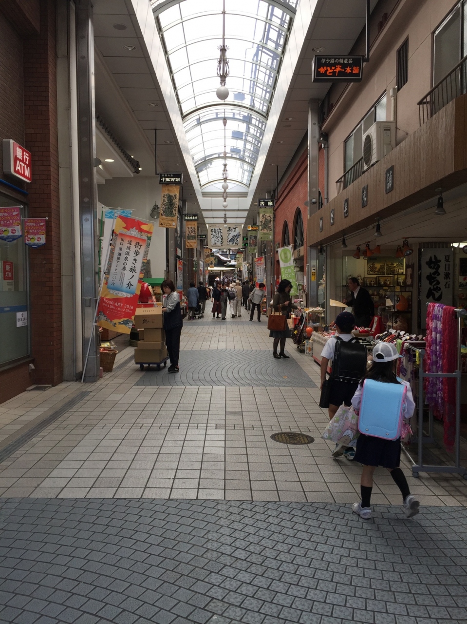 ハイカラ通りは「L」の字になっていて、伊予鉄道の道後温泉駅から250メートルのハイカラ通りを歩くと道後温泉本館に続くようになっていて、なかなか機能的です。商店街(アーケード街)になっていて、お土産屋さん、レストラン・カフェなど約60ものお店が軒を連ねています。道後温泉本館で入浴と道後ハイカラ通りをブラブラするのがセットで定番ですね。