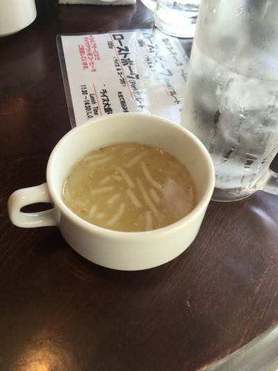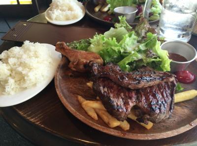 180gのステーキにライススープ・テイクアウトのコーヒー(回転をよくするためテイクアウトのようです)がついて950円とかなりお得ですね。添え物として乗っているのはなんとチキン。これまたお得感UPな脇役です。