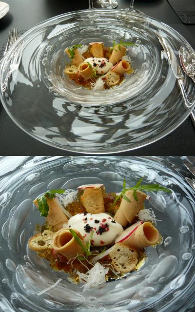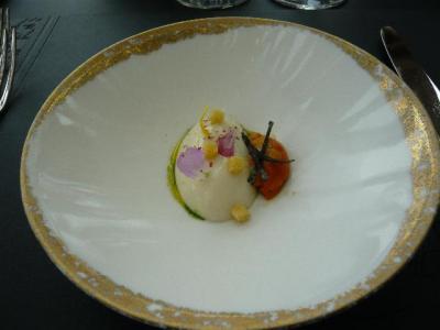 最初のウェルカムプレート(コースメニューに載りません)、又は2番目の前菜が一番美味しく、客の舌を感激させ、味覚を麻痺させた後の皿は、徐々に味が落ちていきます(笑)。