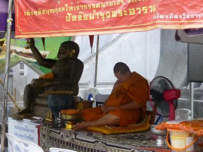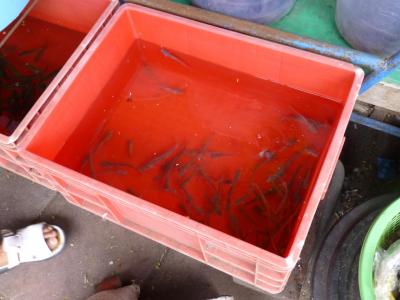 船を降りると、お寺までの道沿いに、徳を積む(タンブン)ための「放生」(生き物を逃がす)用の魚やエサのパンなどが売られています。