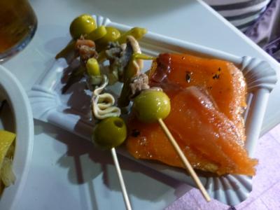 各店にはピンチョスやタパスなどが店頭に置かれているの、それを食べたい分だけ購入できます。また海産物を焼いたりしてくれます。ワインやビールが売られている店もあります。