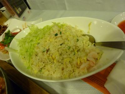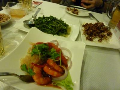 前菜にくらげとエビのサラダ、ビールのおつまみとしてホタルイカのから揚げ、空芯菜の炒め物、シーフードチャーハン、メインのチリクラブを頼みました。